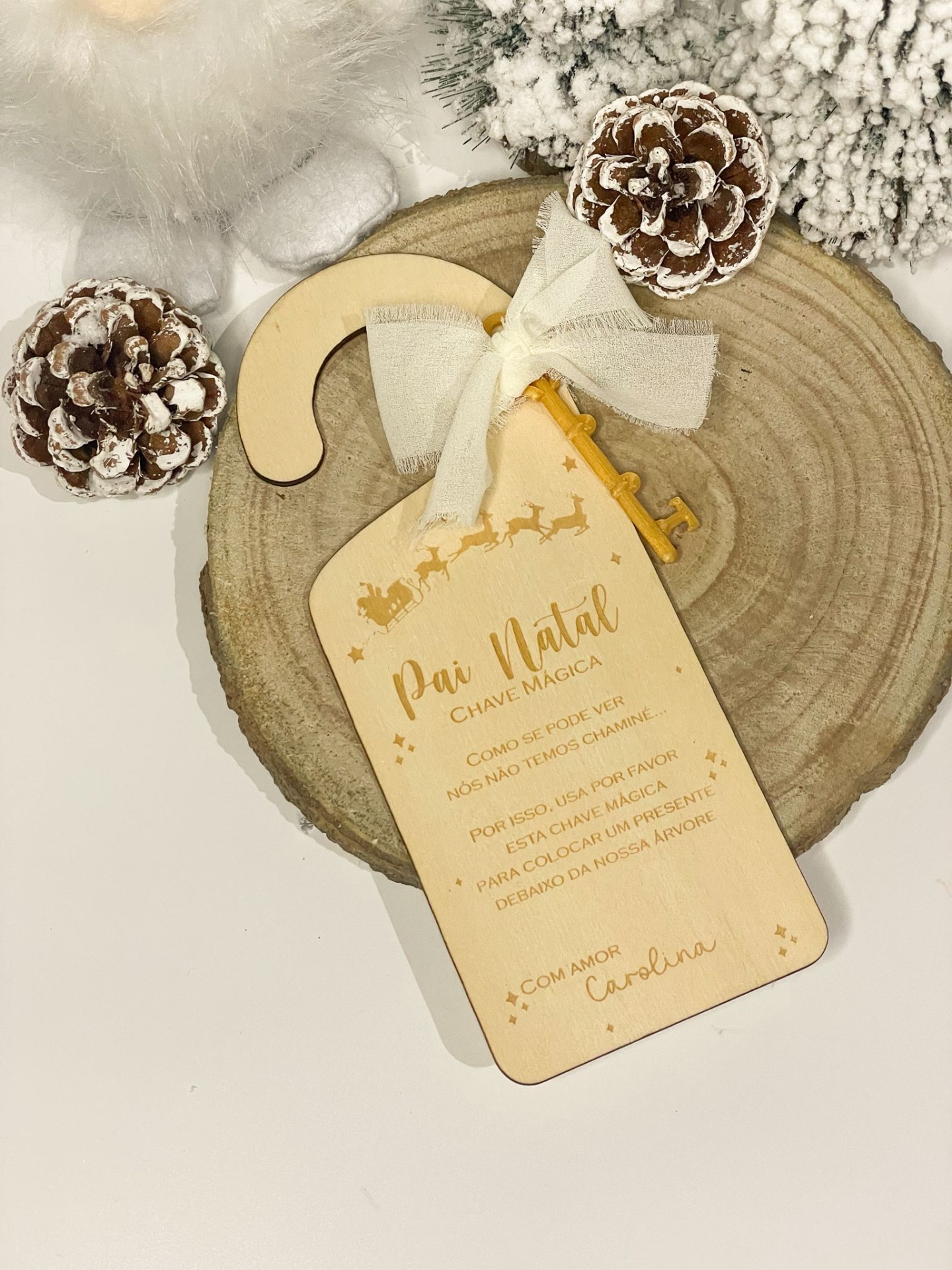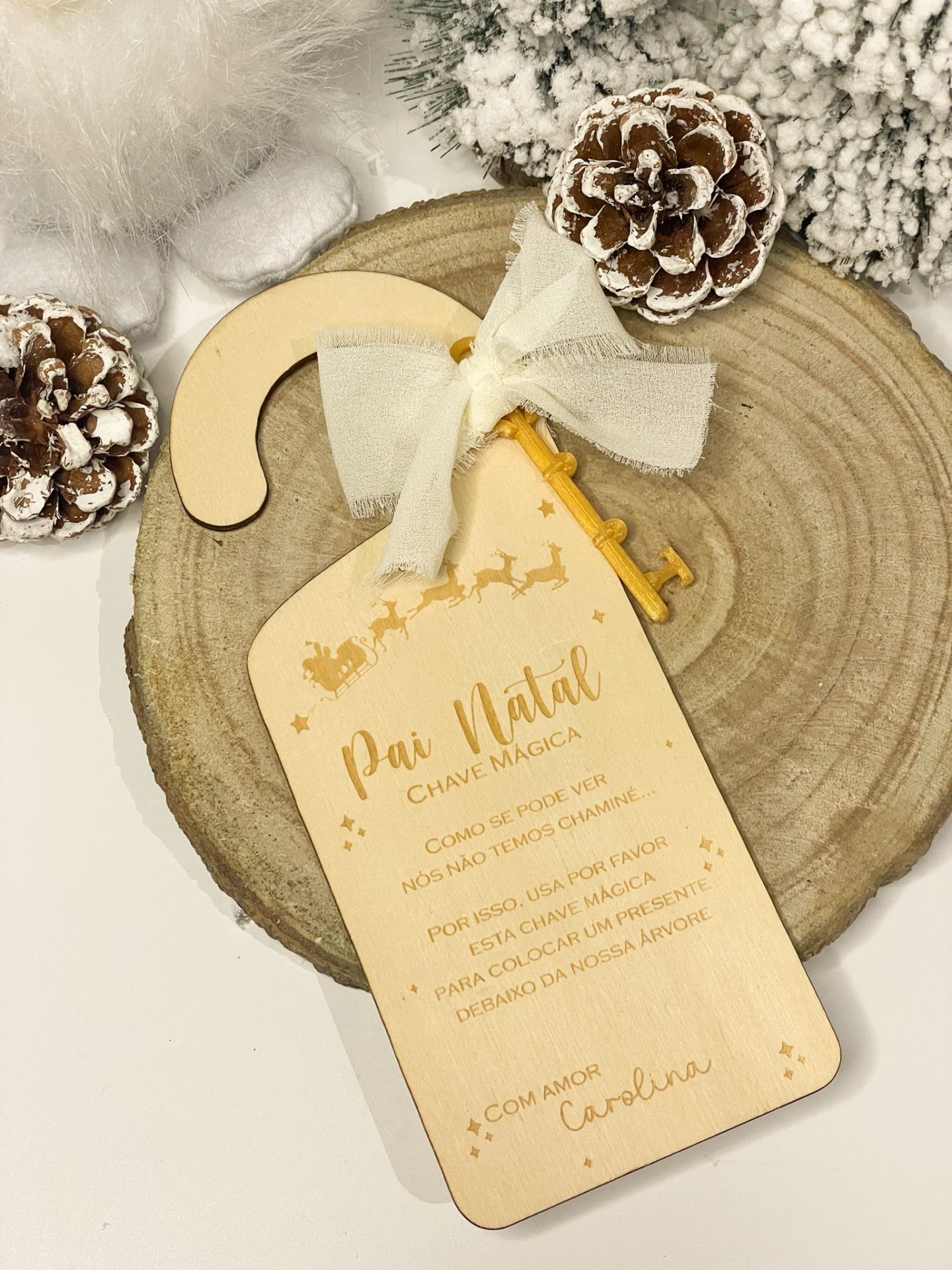 Feita em madeira natural e gravada a laser, esta peça encantadora é ideal para as casas sem chaminé — basta pendurar a chave para que o Pai Natal possa entrar e deixar os presentes com magia!