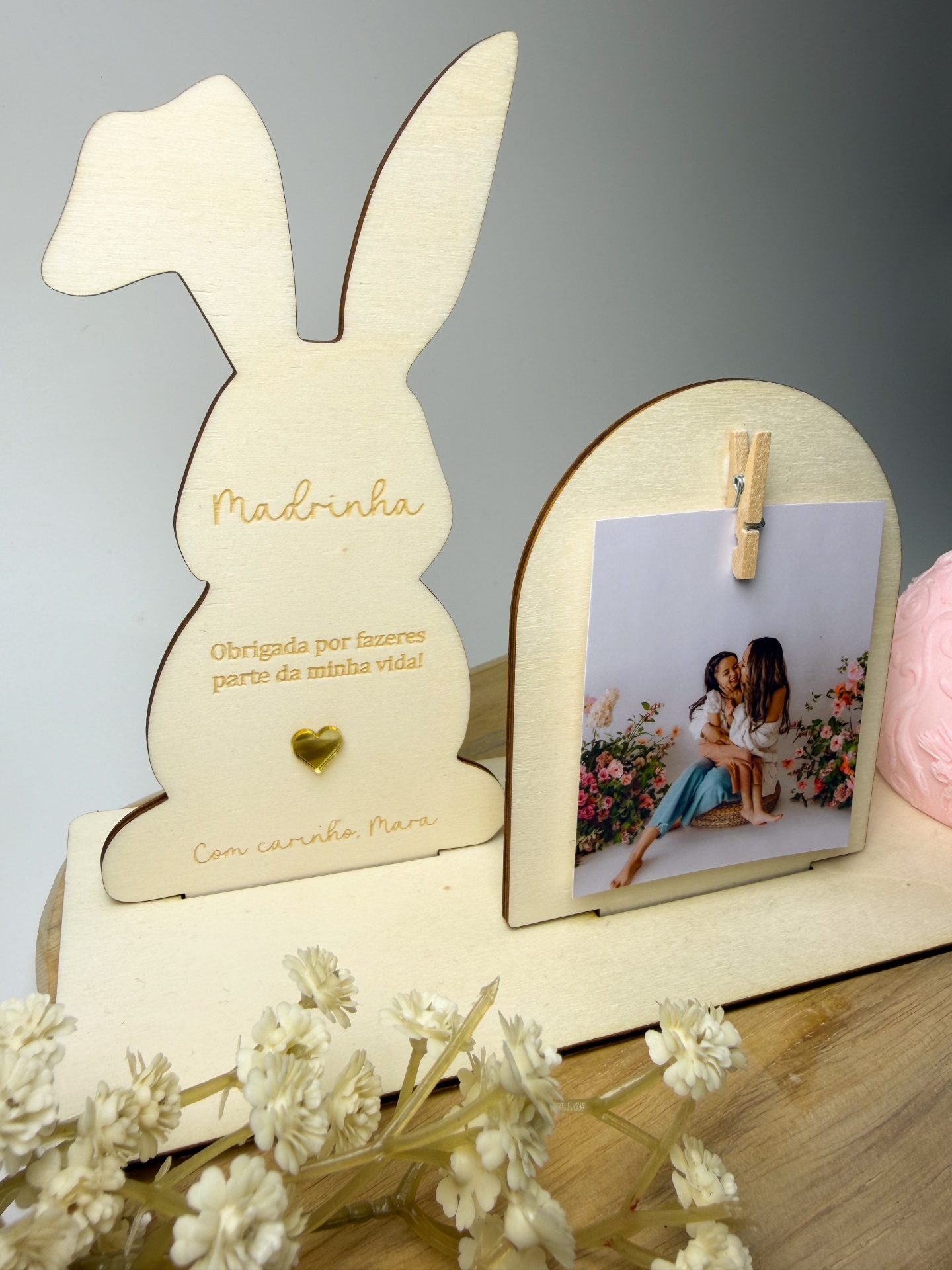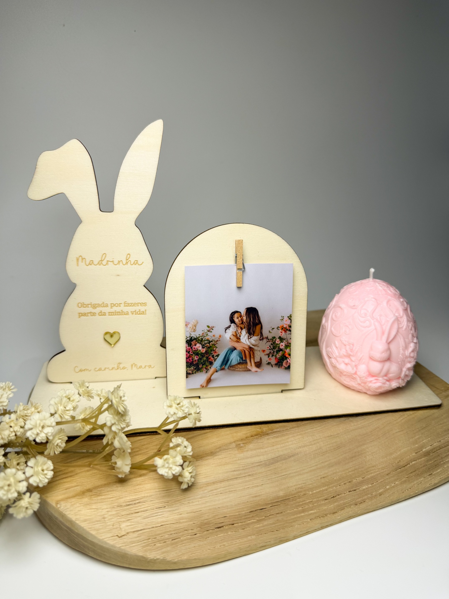 Este conjunto decorativo em madeira foi pensado para celebrar os laços mais especiais. Com um delicado coelhinho personalizado, uma moldura minimalista para fotografia e uma vela decorativa alusiva à Páscoa cria uma composição harmoniosa e acolhedora 🌸