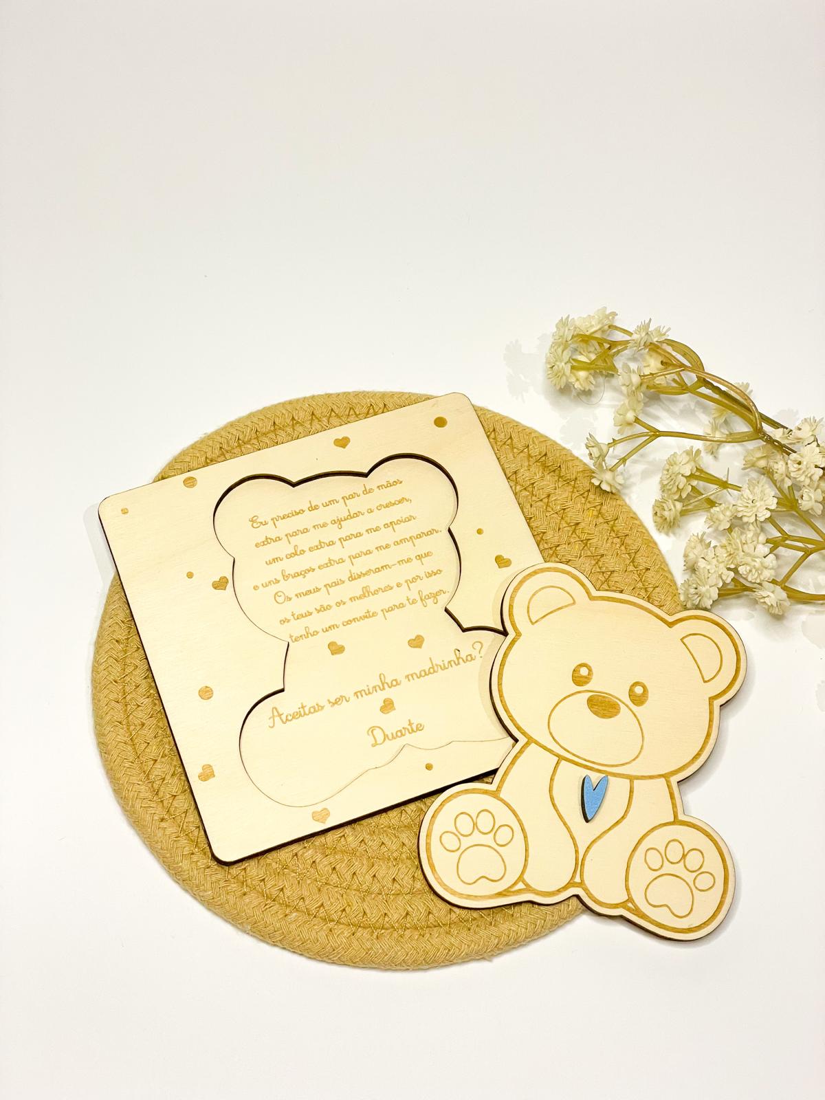 🧸 Convite para Madrinha em Madeira – Tema Ursinho
