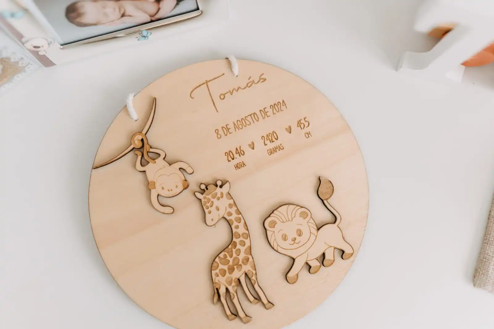 Placa de nascimento personalizada em madeira natural, ideal para registar e eternizar os dados mais importantes do nascimento do bebé. Inclui nome, data, hora, peso e altura, com um delicado design em relevo inspirado na selva, com animais adoráveis que tornam a peça ainda mais especial.